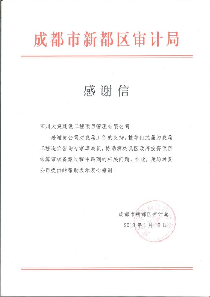 成都市新都審計(jì)局對我公司的業(yè)務(wù)水平有著很高的評價(jià),特推薦我公司一部經(jīng)理冉武昌為貴局工程造價(jià)專家?guī)斐蓡T,協(xié)助解決新都區(qū)政府投資項(xiàng)目結(jié)算審核備案過程中的相關(guān)問題。感謝新都審計(jì)局的信任與厚愛,我們會報(bào)以優(yōu)秀的工作成果。