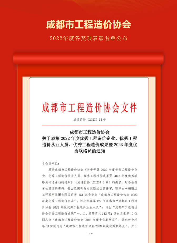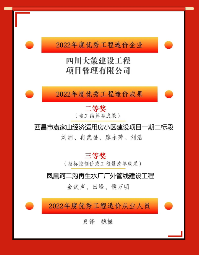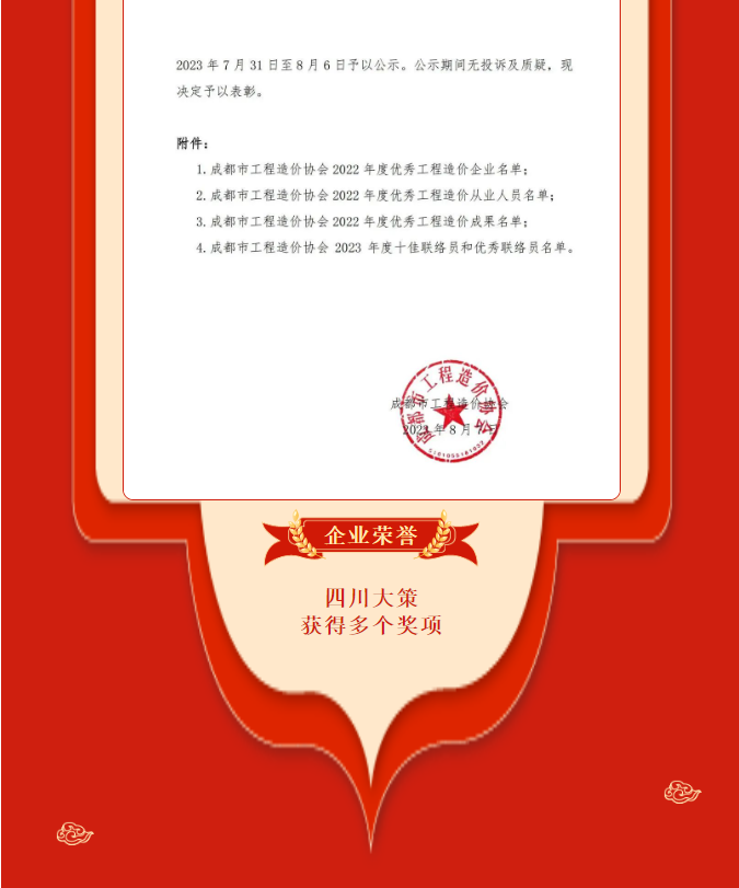 企業(yè)榮譽(yù) |四川大策榮獲成都市工程造價(jià)協(xié)會(huì)多個(gè)獎(jiǎng)項(xiàng)