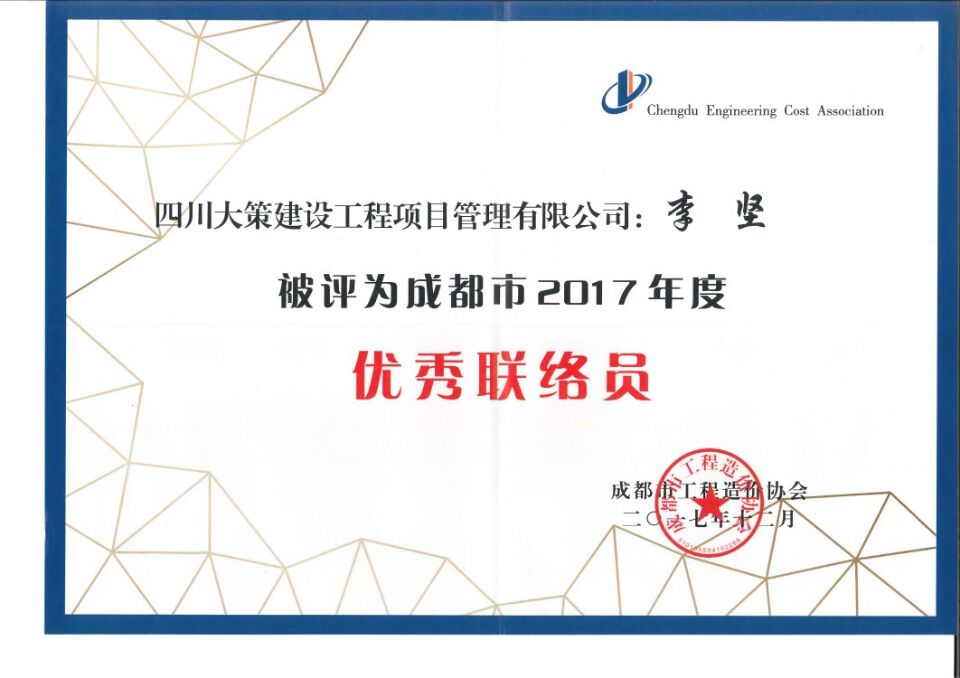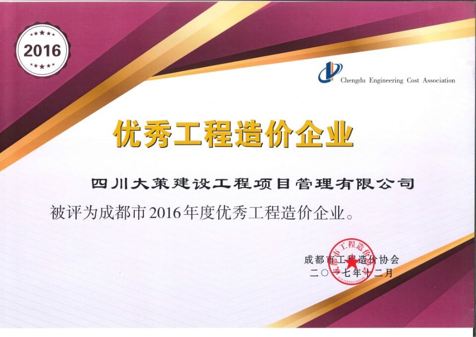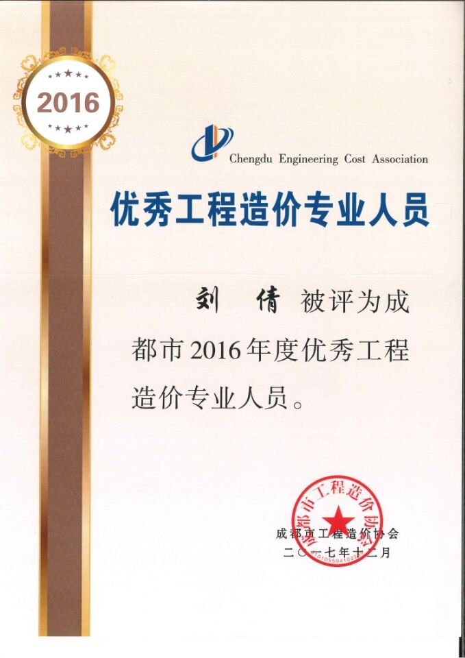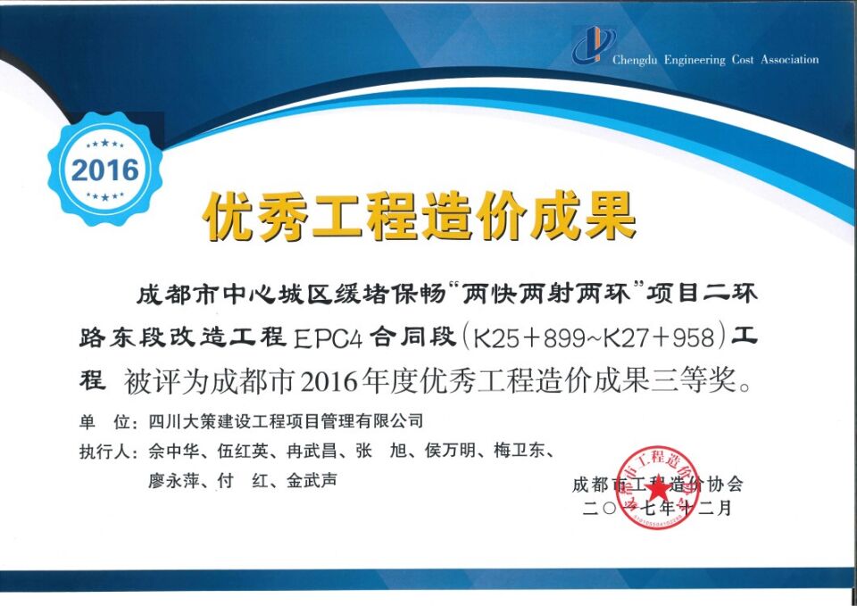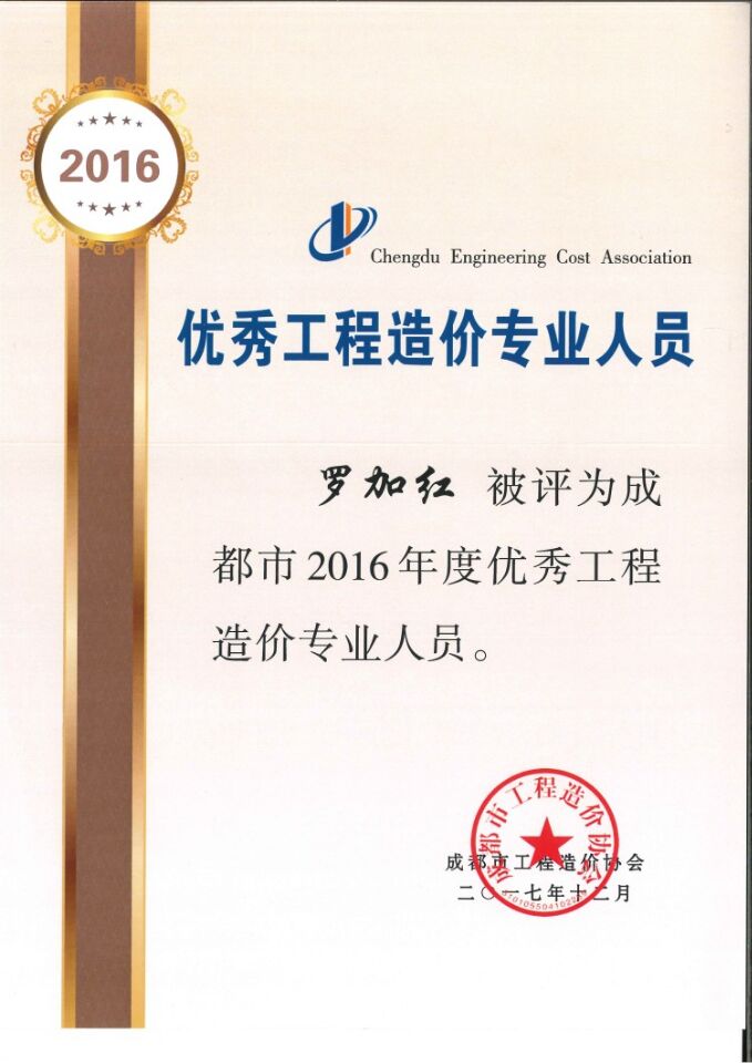 我公司獲2016年成都市優(yōu)秀造價(jià)工程咨詢企業(yè),劉倩和羅家紅獲優(yōu)秀造價(jià)人員,李堅(jiān)獲優(yōu)秀聯(lián)絡(luò)員,二環(huán)路東段改造工程EPC4合同段獲成都市優(yōu)秀造價(jià)咨詢成果三等獎。獲得的這些表彰是對我們公司的極大肯定,也是對我們公司員工業(yè)務(wù)水平的極大肯定。回顧昨天,展望明天。在新的一年我們將緊緊圍繞確定的各項(xiàng)目標(biāo)任務(wù)做到精心謀劃、統(tǒng)籌安排、狠抓落實(shí)繼續(xù)保持穩(wěn)步、協(xié)調(diào)、積極發(fā)展的良好態(tài)勢迎接新的機(jī)遇與挑戰(zhàn)。